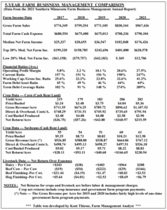The Farm Business Management (FBM) Summary for Southern and West Central Minnesota is prepared by the Farm Business Management Instructors. This summary includes an analysis of the farm business records from farm businesses of all types and sizes in Southern and Western Minnesota. This annual farm business summary is probably one of the best gauges of the profitability and financial health of farm businesses in the region on an annual basis. Following are some of the key points and data that were in the 2021 FBM Summary: