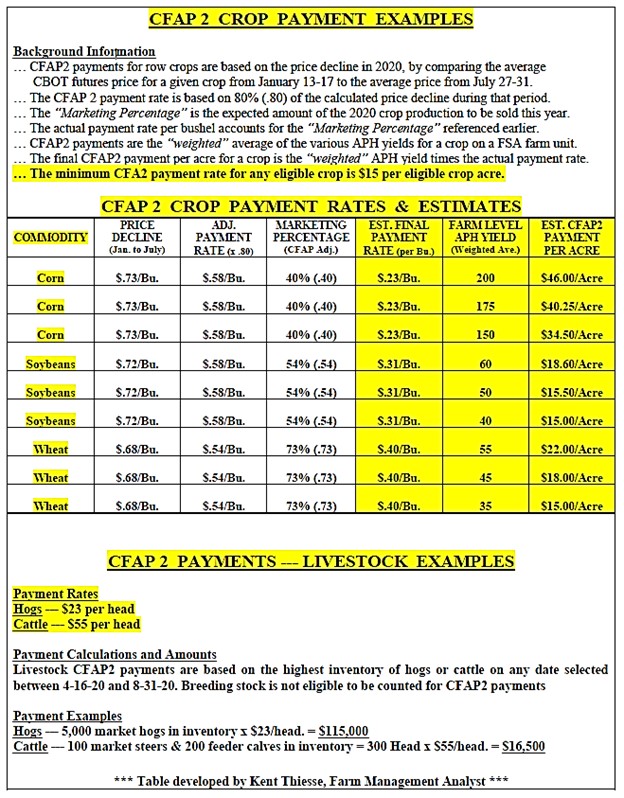 Corn -500 acres x 180 Bu./A. APH x $.23/Bu. = $20,700 CFAP2 payment (est.)
