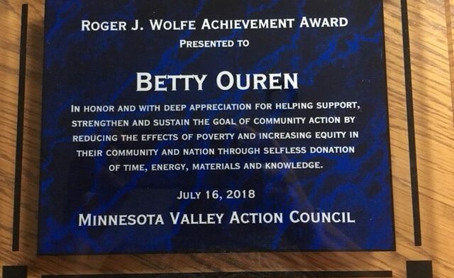 Minnesota Valley Action Council (MVAC) held their 52nd Annual Meeting and Awards Dinner on Monday July 16th. Our own Betty Ouren received the Roger J. Wolfe achievement award. She was nominated by Kip Bruender. In honor and with deep appreciation for helping support, strengthen and sustain the goal of community action by reducing the effects of poverty and increasing equity in their community and nation through selfless donation of time, energy, materials and knowledge.
